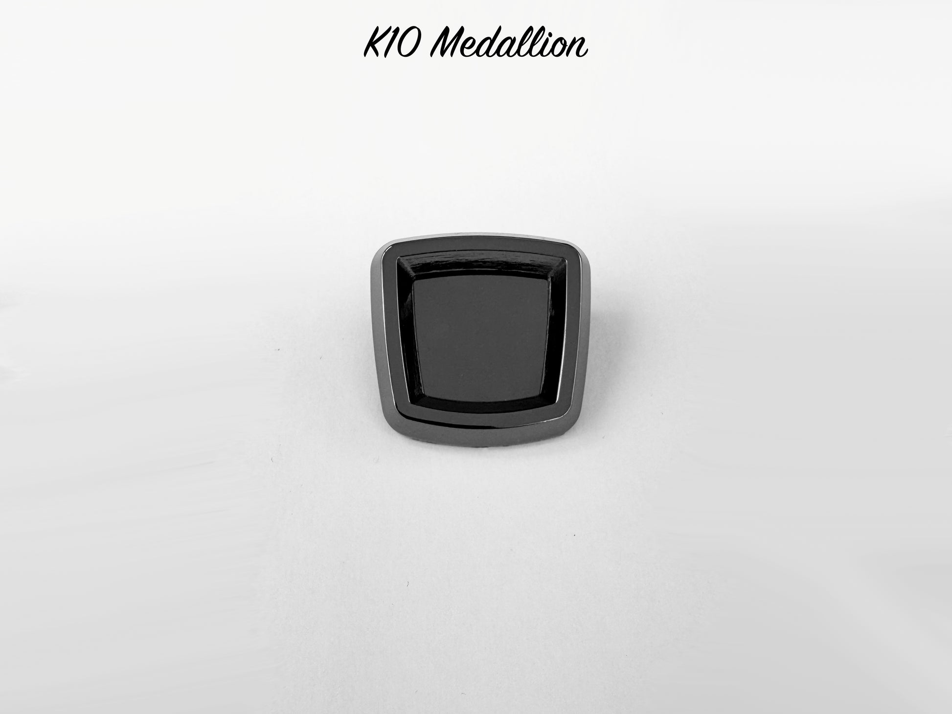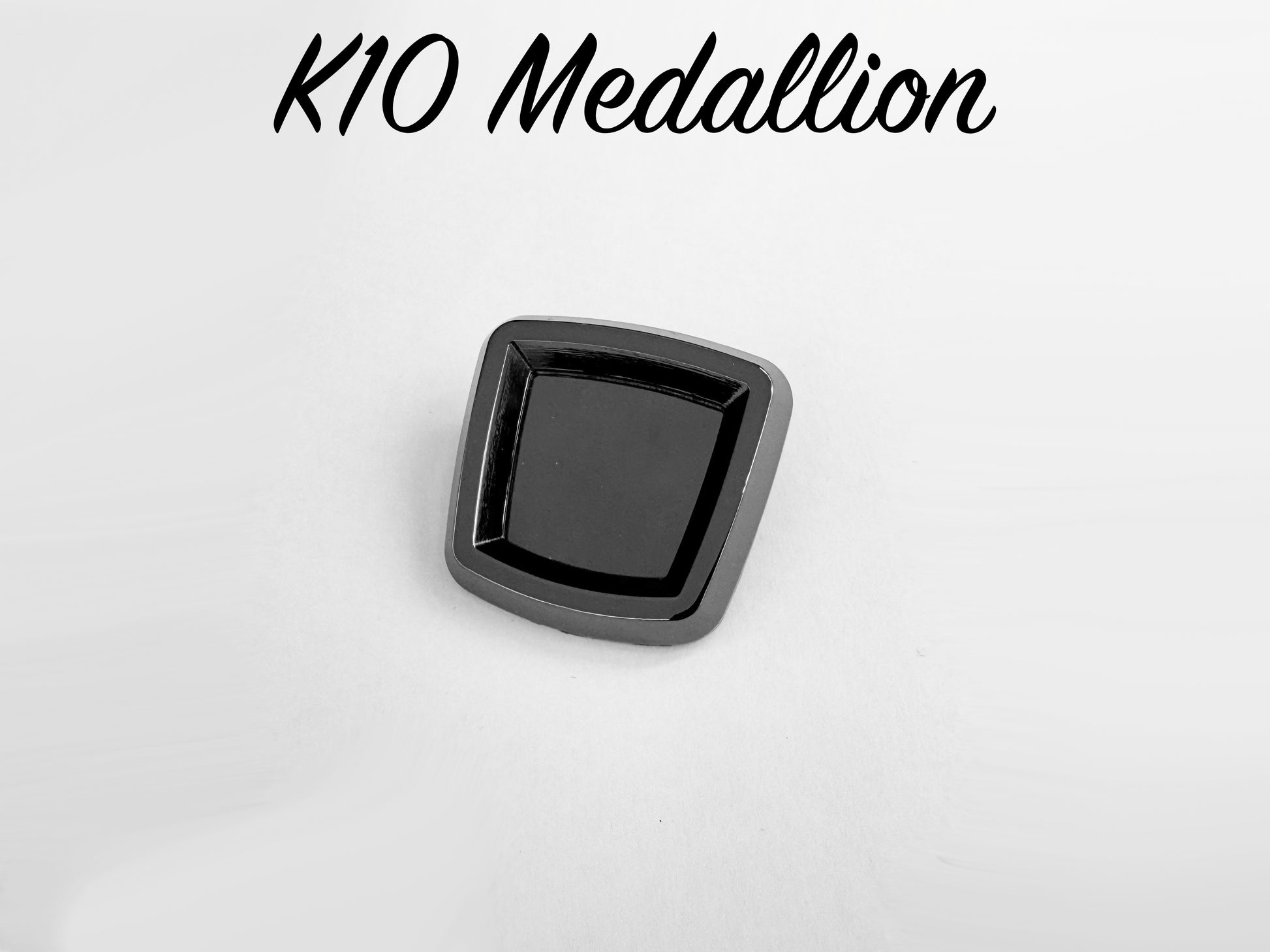 These K10 Medallions measure about 1.79" by 1.76" and are plated in a dark shiny gunmetal color! At the thickest, these are about 0.25" thick.
