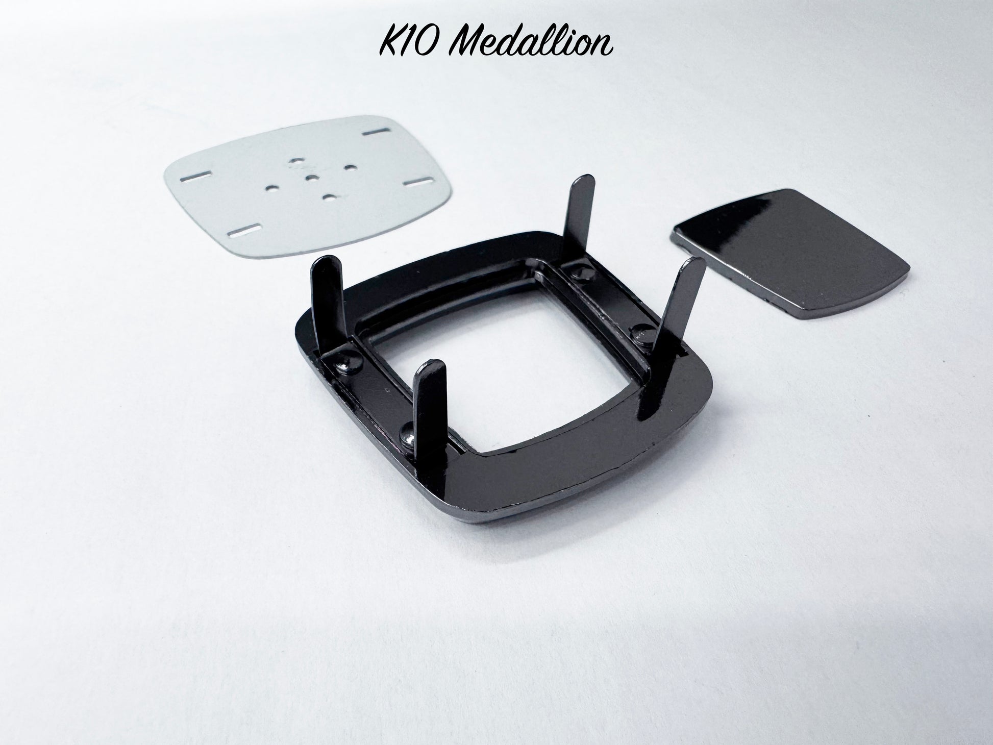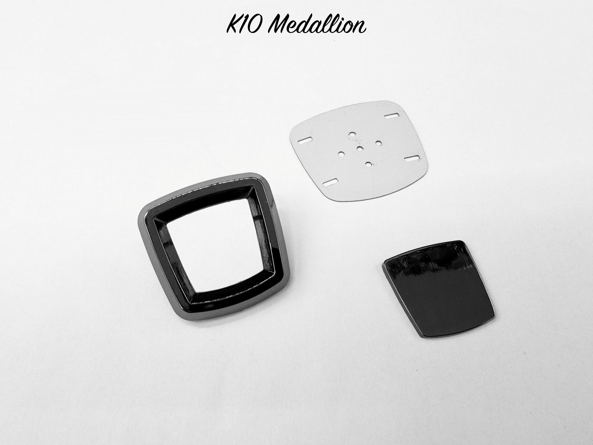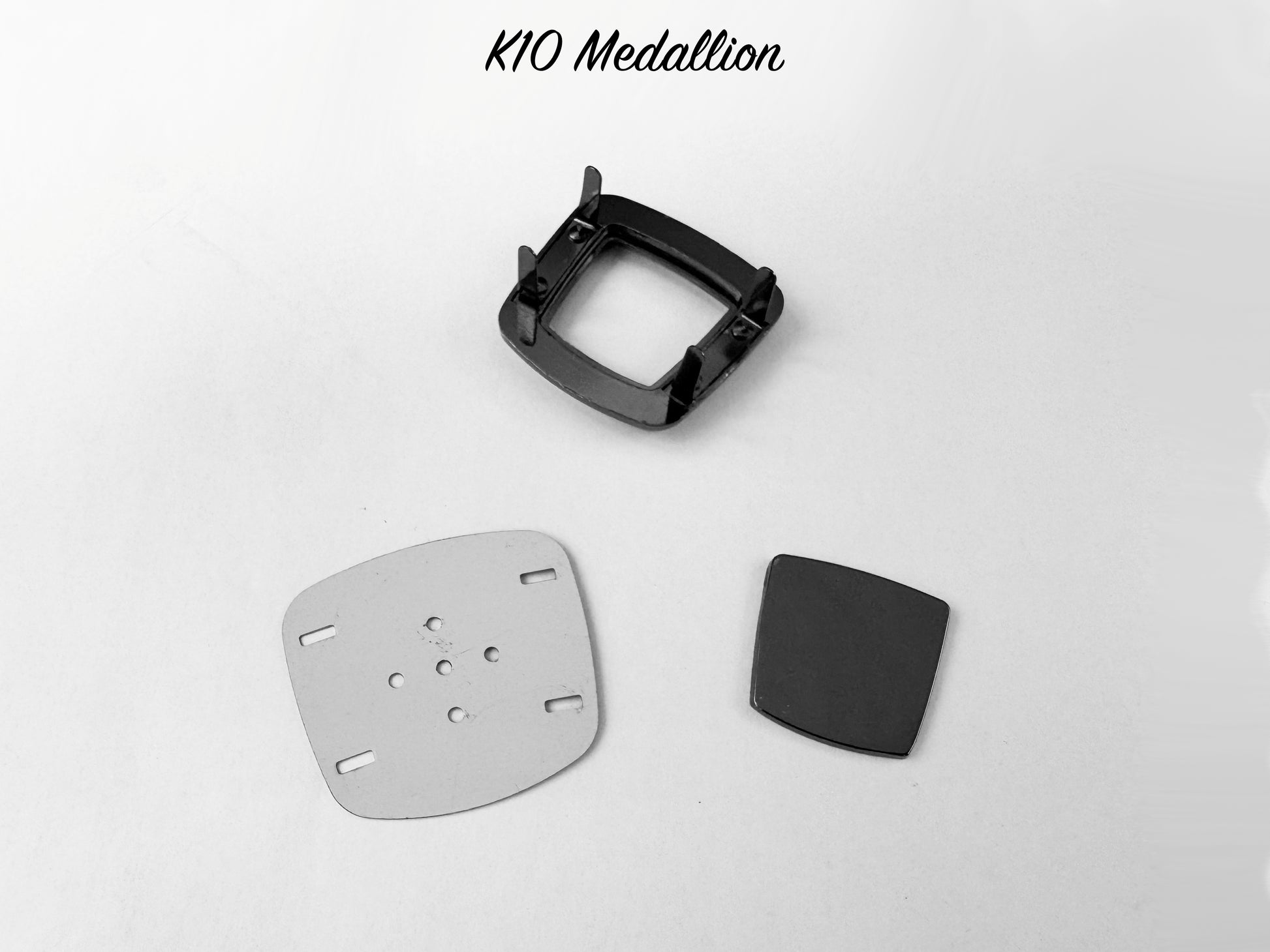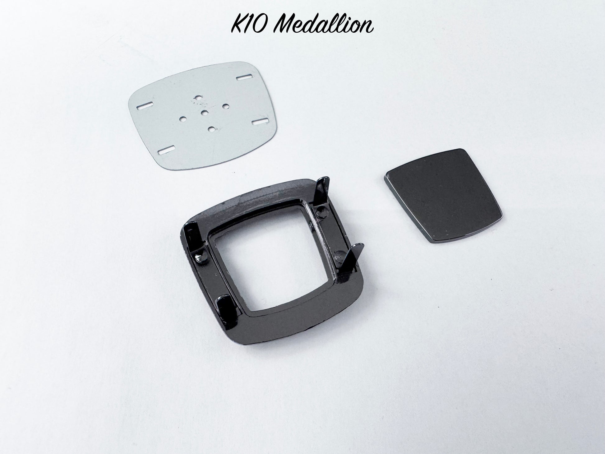 Our K10 Medallions come with three pieces. The outer gunmetal bezel, the gunmetal center insert, and the backing plate. The center insert does not have to be used. If you choose to use the center insert, it can be left gunmetal, covered in material, be painted or powdercoated...